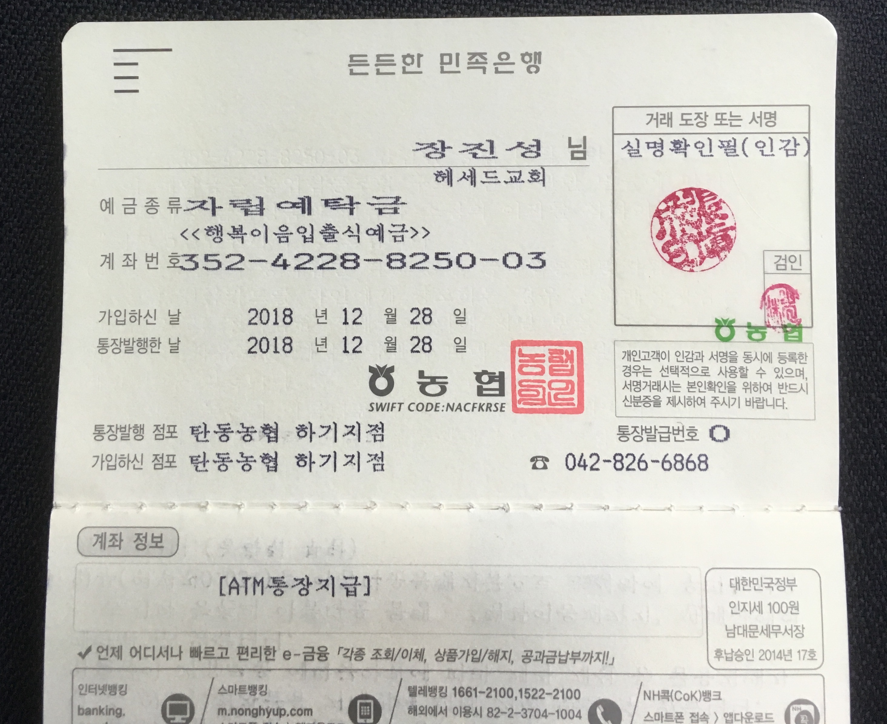 사진에 보시는 바와 같이 통장에는 "장진성 헤세드교회"로 되어있으나